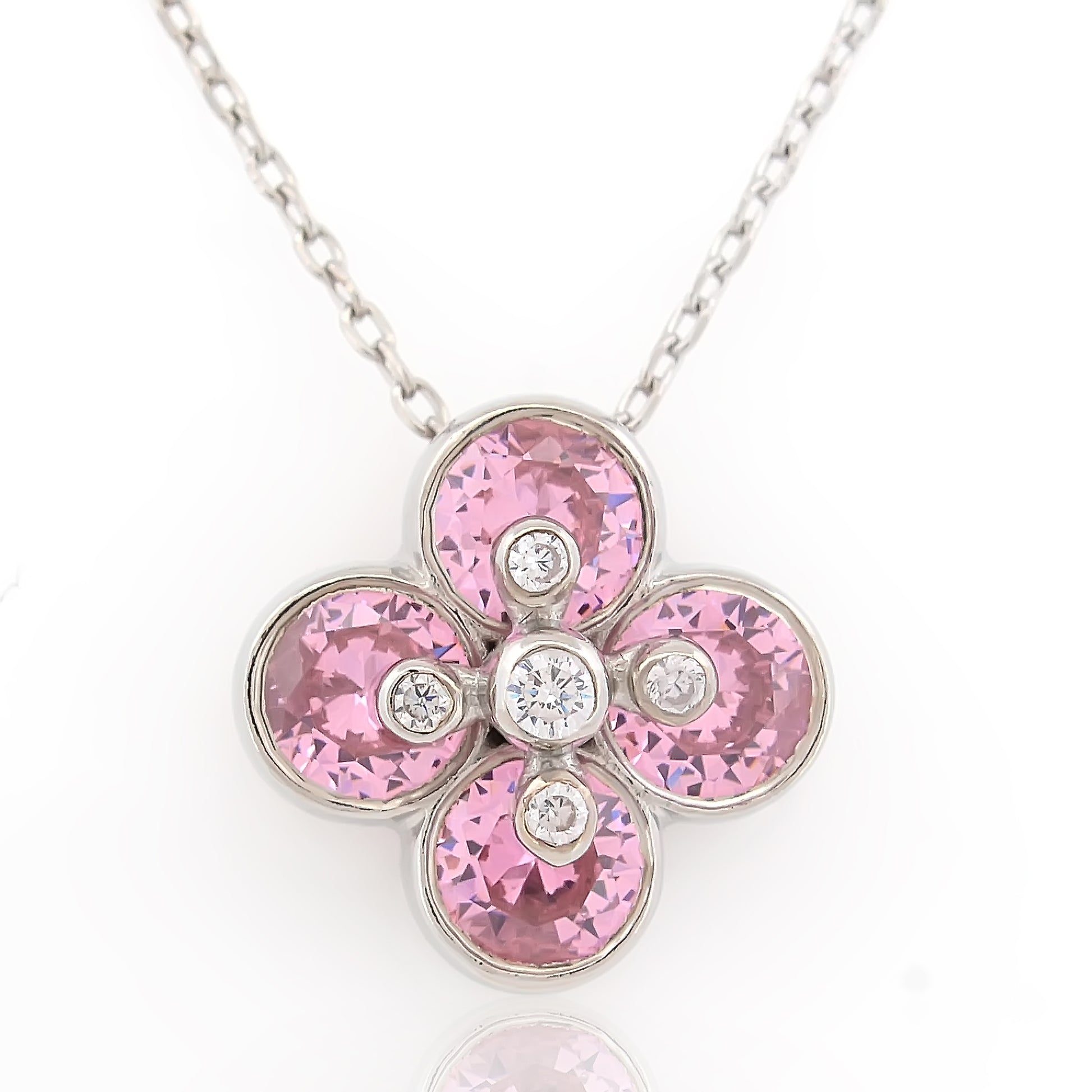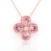 This charming necklace features a floral pendant in rose gold, intricately crafted with petals of pink and lavender gemstones and accented by central white crystals. Its design is inspired by the blooming flowers of spring, symbolizing renewal and femininity. Perfect for adding a touch of soft, romantic elegance to any outfit, it gracefully captures the essence of nature’s beauty.